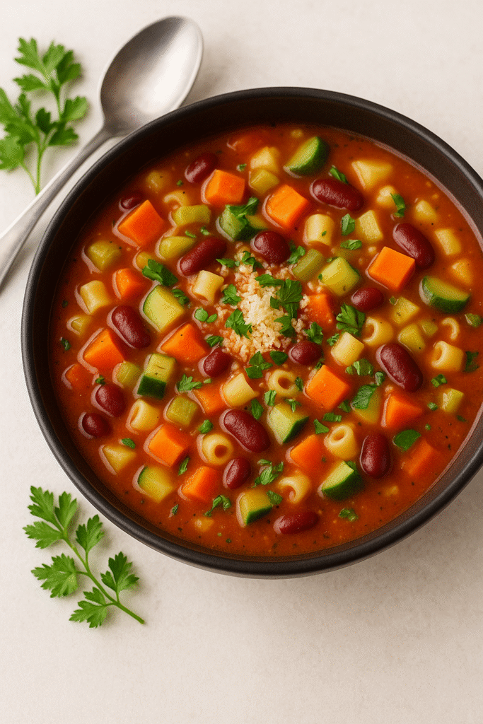 Minestrone er en klassisk italiensk grøntsagssuppe, som varierer efter sæson og hvad man har i køkkenet. Den er farverig, fyldt med grøntsager, pasta eller ris og smagt til med krydderurter. Perfekt til de kølige efterårsdage, men også let nok til at nydes om foråret eller sommeren. Minestrone er sund, mættende og nem at lave – et måltid, der samler hele familien om bordet.